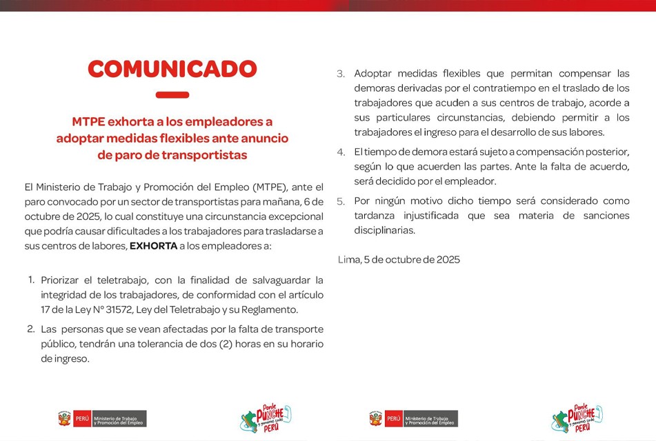 Lima, 06 de octubre de 2025.- Ministerio de Trabajo y Promoción del Empleo (MTPE), ante el paro convocado por un sector de transportistas para este lunes 6 de octubre de 2025, lo cual constituye una circunstancia excepcional que podría causar dificultades a los trabajadores para trasladarse a sus centros de labores, exhorta a los empleadores a priorizar el teletrabajo.