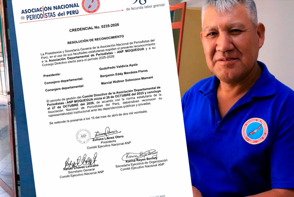 Moquegua, 16 de Abril 2026.- En el marco de sus atribuciones estatutarias, la Asociación Nacional de Periodistas del Perú (ANP) emitió la Resolución de Reconocimiento mediante la cual oficializa a la nueva Junta Directiva de la Asociación Departamental de Periodistas – ANP Moquegua para el periodo 2025–2028.