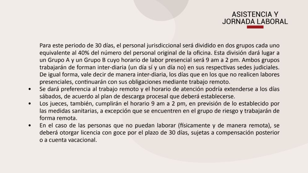 El horario de la jornada laboral por el período que señala el protocolo en el punto 6.1, a) y b) será de 09.00 a.m. a 2.00 p.m. en los grupos que corresponda. Este horario se aplica para todos los miembros del Poder Judicial, jueces, funcionarios y trabajadores”.