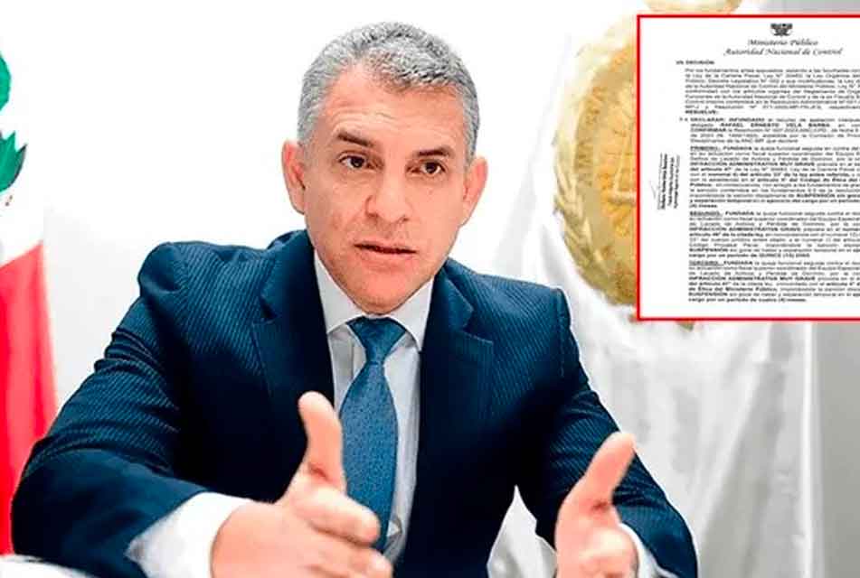 La Autoridad Nacional de Control (ANC) de la Fiscalía confirmó, este viernes 24 de noviembre, la suspensión por 8 meses y 15 días, sin goce de haber, contra el fiscal superior Rafael Vela tras revisar el recurso de apelación que realizó el también coordinador del Equipo Lava Jato contra dicha sanción, el pasado 30 de octubre, y declararlo «infundado».