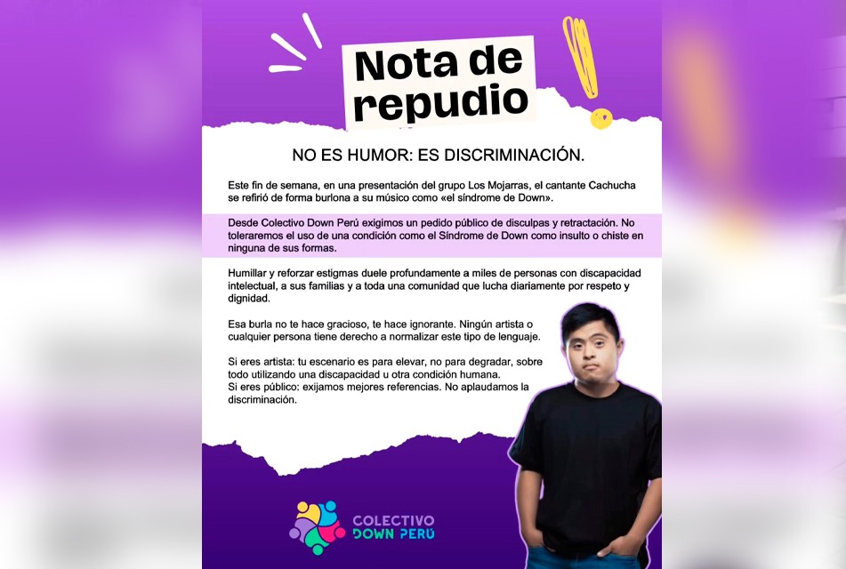 RCR, 27 de abril de 2026.- Giselly Alvarado, presidenta y fundadora de Colectivo Down Perú, mostró su total rechazo a las declaraciones discriminatorias hechas por el cantante “Cachuca”. Señaló que denigrar a las personas por su condición de discapacidad o característica diferente demuestra que la sociedad se encuentra cada vez más deshumanizada, y que la población requiere tomar mayor conciencia del valor y respeto hacia las demás personas.
