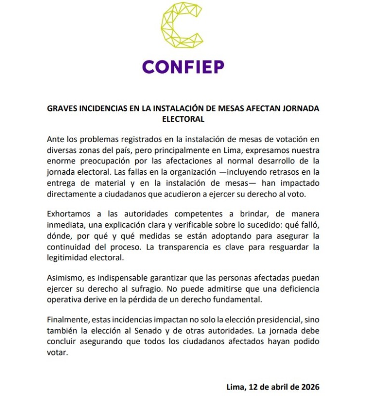 RCR, 12 de abril 2026.- .- La Confederación Nacional de Instituciones Empresariales Privadas (Confiep) expresó su enorme preocupación ante los problemas registrados en la instalación de mesas de votación en diversas zonas del país, con especial énfasis en la capital.