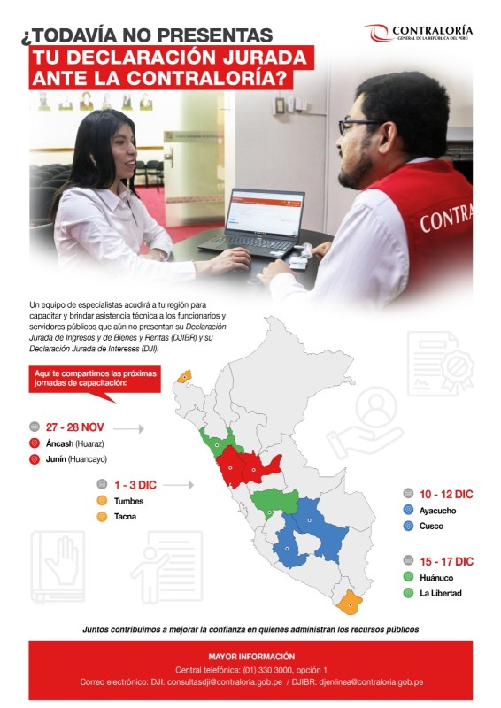 La Contraloría General de la República inició una campaña nacional orientada a reforzar el cumplimiento de la obligación que tienen los funcionarios y servidores públicos de presentar, en los plazos establecidos, tanto la Declaración Jurada de Ingresos y de Bienes y Rentas (DJIBR), así como la Declaración Jurada de Intereses (DJI).