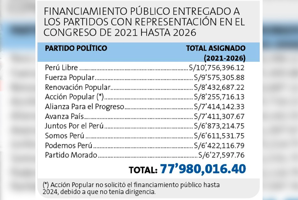 Lima, 15 de diciembre de 2025.- Mientras millones de peruanos sobreviven con ingresos que apenas alcanzan el sueldo mínimo y el Estado enfrenta enormes brechas en pobreza, infraestructura y servicios esenciales, los partidos con representación en el Congreso habrán recibido, al término del actual Parlamento en julio de 2026, casi S/78 millones en financiamiento público estatal.