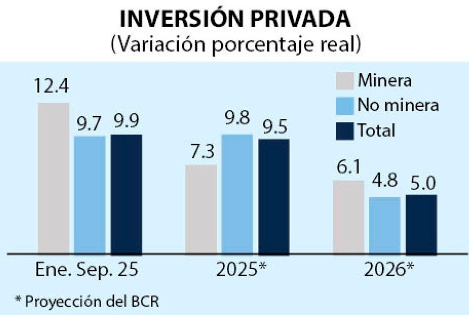 La inversión privada mantuvo un crecimiento de dos dígitos en 2025, impulsada principalmente por el buen desempeño de la inversión no residencial, en un contexto marcado por precios internacionales favorables y la ejecución de grandes proyectos. Según el Banco Central de Reserva (BCR), la inversión privada creció 11.4% en el tercer trimestre del año, gracias al impulso del sector minero y de la infraestructura.