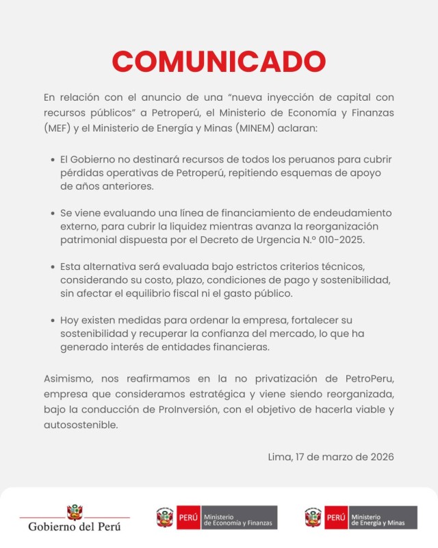 RCR, 17 de marzo 2026.– El Ministerio de Economía y Finanzas (MEF) y el Ministerio de Energía y Minas (MINEM) informaron mediante un comunicado que se encuentran evaluando una línea de financiamiento mediante endeudamiento externo para cubrir las necesidades de liquidez de Petroperú. Esta medida se plantea como una alternativa técnica para sostener las operaciones de la empresa estatal mientras se ejecuta la reorganización patrimonial dispuesta por el Decreto de Urgencia N.º 010-2025, bajo la conducción de ProInversión.