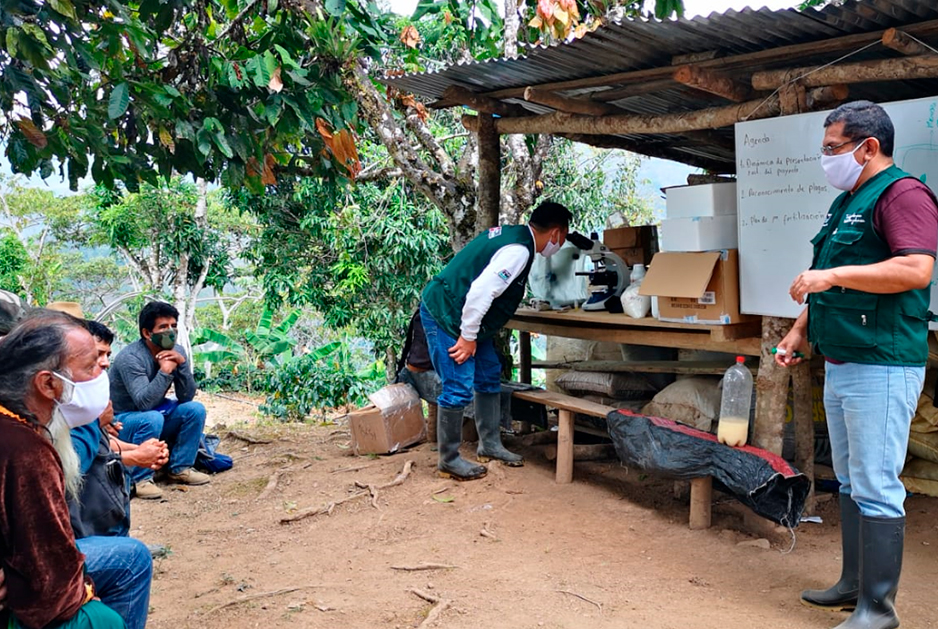 RCR, 12 de octubre de 2020.- El jefe del proyecto café en la zona del Valle de los Ríos Apurímac, Ene y Mantaro (Vraem) del Instituto Nacional de Innovación Agraria (INIA) del Ministerio de Agricultura y Riego (Minagri), José Tejada, informó que un equipo de técnicos viene realizando trabajos de investigación directamente en las parcelas de producción de los agricultores cafetaleros, para el control de plagas con productos biológicos que no dañan el ambiente.