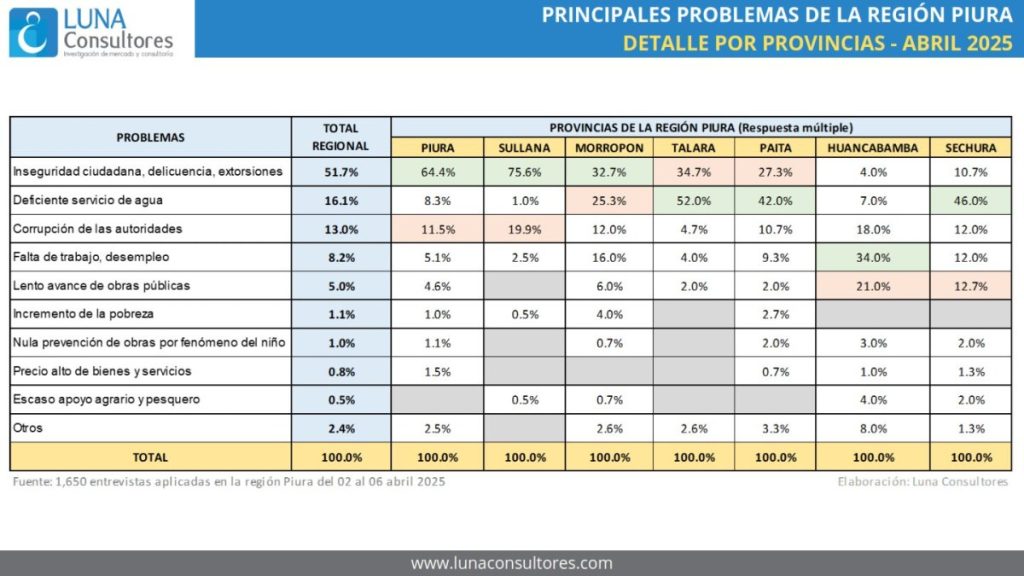 Precisó que uno de los hallazgos más alarmantes del estudio es el alto nivel de preocupación por la inseguridad ciudadana, que alcanza el 51.7% en la región y se eleva hasta un 75.6% en provincias como Sullana. Asimismo, mencionó que la situación es tan crítica que el 94% de los piuranos teme ser víctima de la delincuencia en los próximos 12 meses, a esto se suma problemas con el déficit hídrico y la corrupción.