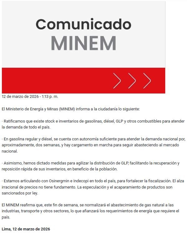 Lima, 12 de marzo 2026.- Ante la creciente preocupación por la disponibilidad de energéticos en el país, el Ministerio de Energía y Minas (MINEM) emitió hoy un comunicado oficial para llevar tranquilidad a la ciudadanía y a los sectores productivos. La entidad confirmó que existe un stock garantizado de gasolinas, diésel y Gas Licuado de Petróleo (GLP) para cubrir la demanda nacional.