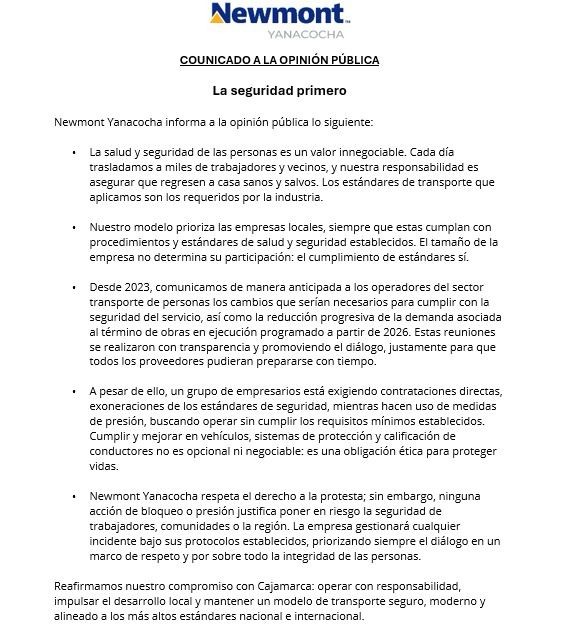 RCR, 23 de marzo 2026.- A través de un comunicado oficial, Newmont Yanacocha fijó su postura frente a las recientes medidas de presión adoptadas por un sector de empresarios del transporte local. La compañía enfatizó que la salud y seguridad de sus trabajadores y vecinos son valores «innegociables» y que los estándares aplicados son los requeridos por la industria global.