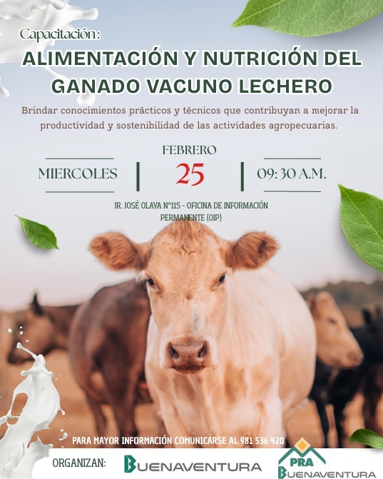 RCR, 13 de febrero de 2026.- Con el objetivo de fortalecer las capacidades productivas de los ganaderos de la provincia de Oyón, se desarrollará la capacitación “Alimentación y Nutrición del Ganado Vacuno Lechero”, una iniciativa orientada a mejorar la productividad y sostenibilidad de las actividades agropecuarias en la zona.