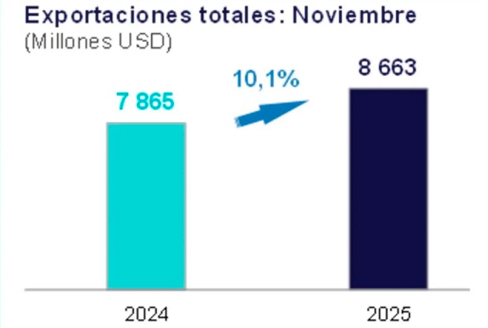 En este contexto, en noviembre de 2025 el valor de las exportaciones totales ascendió a 8,663 millones de dólares, lo que representó un crecimiento de 10.1% respecto a noviembre de 2024.