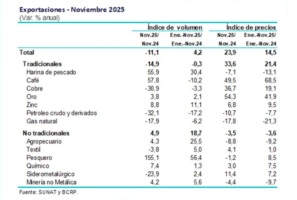 Lima, 20 de enero de 2026.- En el acumulado de los últimos 12 meses a noviembre de 2025, el país destacó como la economía con el mayor dinamismo en las exportaciones no tradicionales dentro de la región, al registrar un crecimiento de 14.5% , superando a Colombia (13%), México (8.2%), Chile (4.4%) y Brasil (3%), señaló el Banco Central de Reserva del Perú (BCR).