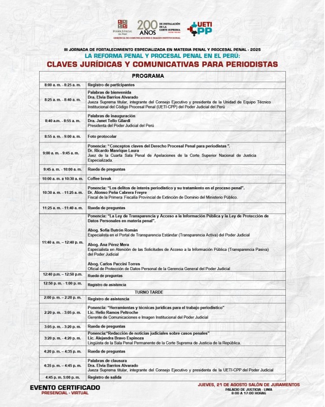 La capacitación se realizará el jueves 21 de agosto, de 8:00 a. m. a 5:00 p. m. en el Salón de Juramentos del Palacio Nacional de Justicia, ubicado en la avenida Paseo de la República s/n, Cercado de Lima.