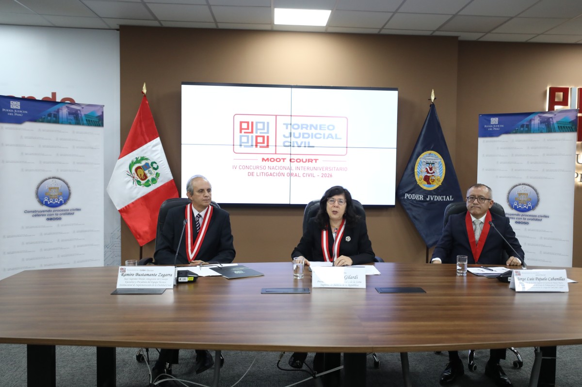 Lima, 17 de Abril 2026.- La presidenta del Poder Judicial, Janet Tello Gilardi, declaró hoy de manera oficial el lanzamiento del IV Concurso Nacional Interuniversitario de Litigación Oral Civil – 2026, evento esperado que busca fortalecer la formación práctica de las y los estudiantes de Derecho de universidades públicas y privadas en litigación oral sobre materia civil.