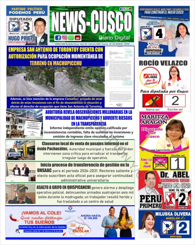 PORTADAS DE PRINCIPALES DIARIOS NACIONALES Y REGIONALES – MIÉRCOLES 18 DE MARZO DE 2026