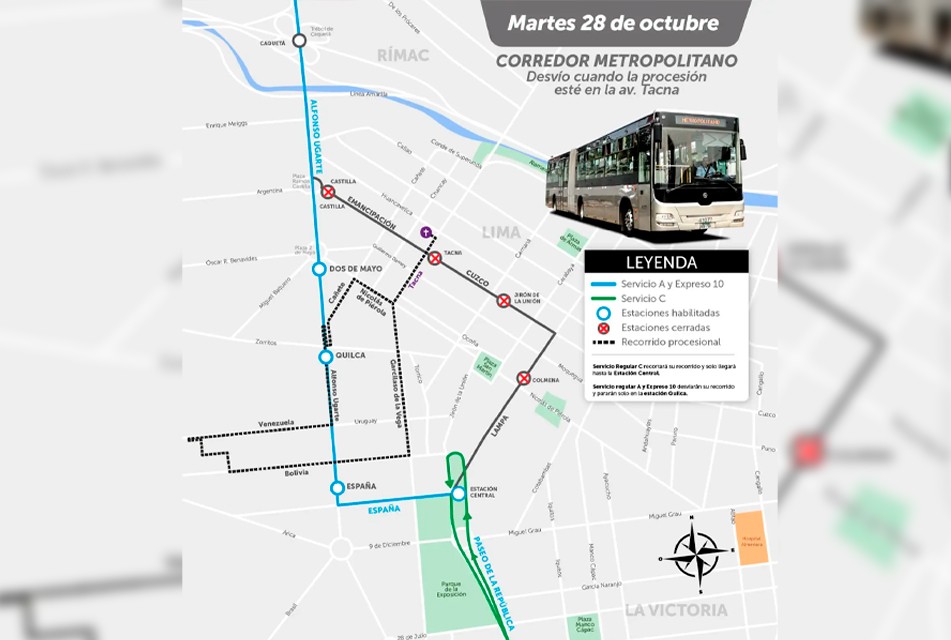 Cuando la procesión recorra la avenida Tacna, el servicio regular A y el Expreso 10 circularán por la av. Alfonso Ugarte, teniendo como única parada la estación Quilca, en tanto el servicio regular C solo llegará hasta la estación Central.