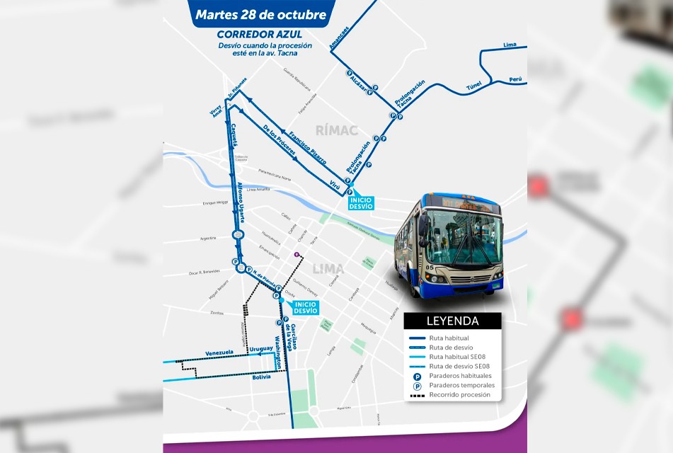 Cuando la procesión ingrese a las avenidas Venezuela, Uruguay y Bolivia, los buses irán por la av. Óscar R. Benavides y Tingo María, en ambos sentidos (Ver mapa).
