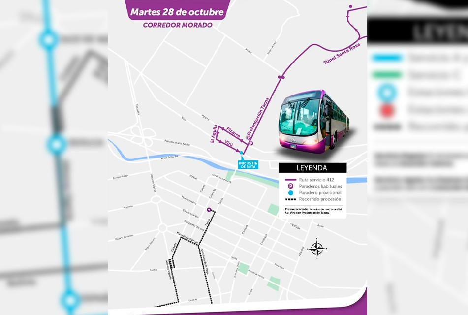 Cuando la imagen del Cristo Moreno recorra la avenida Tacna, el servicio 412 llegará solo hasta el jirón Virú con la av. Prolongación Tacna, para retornar a San Juan de Lurigancho (Ver mapa).