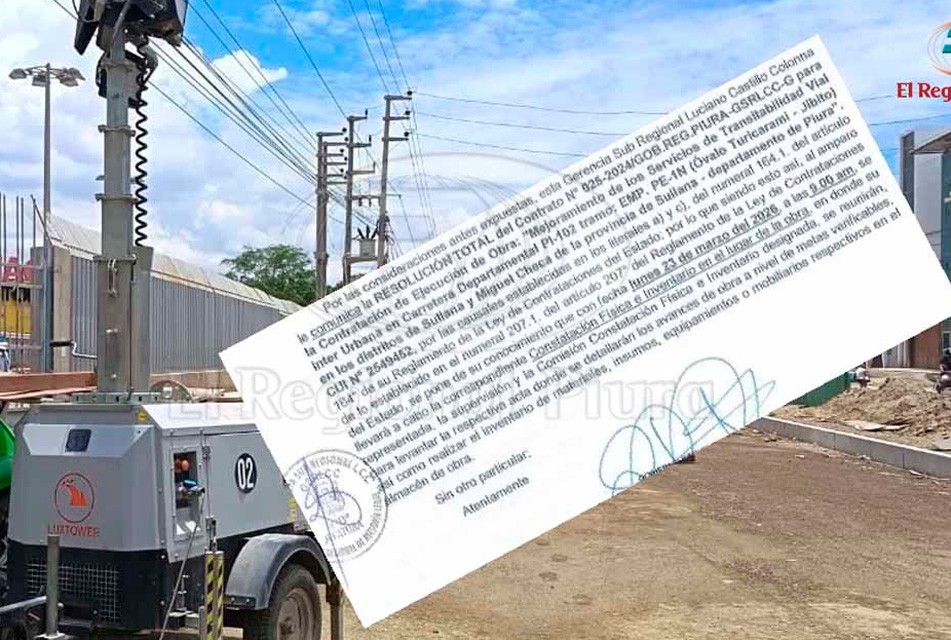 El Gobierno Regional de Piura, a través de la Gerencia Sub Regional Luciano Castillo Colonna, resolvió el contrato de ejecución del proyecto “Mejoramiento de los servicios de transitabilidad vial interurbana en la carretera departamental PL-102, tramo EMP PE-1N (Óvalo Turicarami–Jíbito), en los distritos de Sullana y Miguel Checa, provincia de Sullana”.