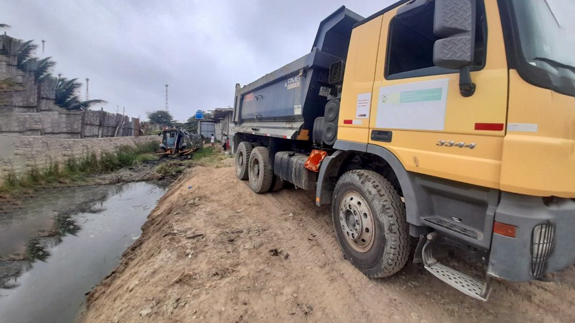 La limpieza y descolmatación del dren, por donde fluyen las aguas de las lluvias, se realizó con maquinaria del Programa Nuestras Ciudades (PNC) del MVCS, que consistió en una excavadora hidráulica, una retroexcavadora y tres camiones volquetes, que trabajaron durante seis días calendarios en un tramo de 604 metros de longitud que se encontraba colmatado.